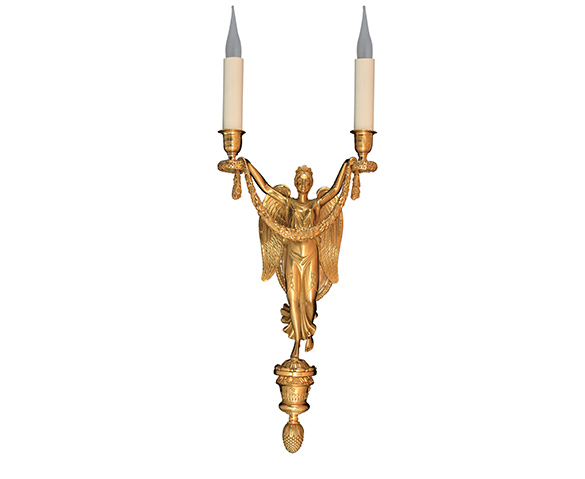 Appliques RĂ©fĂ©rence : 1005BISDĂ©signation : Applique «Femme AilĂ©e» Finition : Or fin et canon de fusil Nombre de LumiĂšres : 2 Hauteur : 34 cm | â : 16 cm Hauteur : 13″ | â : 6″ Fiche PDF*non contractuel