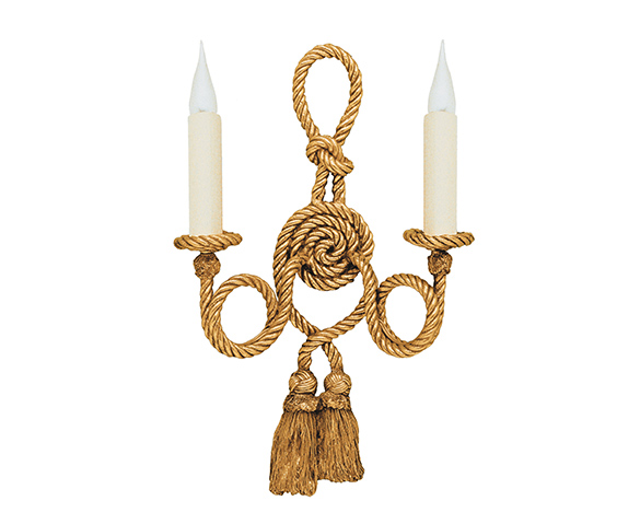 Appliques Référence : 939Désignation : Applique «Cordelière» Finition : Or fin Nombre de Lumières : 2 Hauteur : 38 cm | ∅ : 25 cm Hauteur : 15″ | ∅ : 10″ Fiche PDF*non contractuel